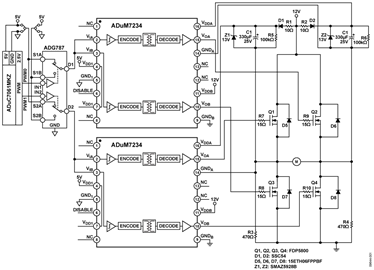 ADuM7234的4 A峰值驱动电流确保功率MOSFET可以高速接通和断开,使得H电桥级的功耗最小。本电路中,H电桥的最大驱动电流可以高达85 A,它受最大容许的MOSFET电流限制。