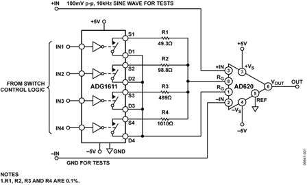 ADG1611具有超低导通电阻特性,对于低导通电阻、低失真性能至关重要的增益开关应用堪称理想解决方案。AD620是一款低成本、高精度仪表放大器,仅需要一个接在引脚1和8上的外部电阻 RG来设置增益,增益范围为1至10,000。