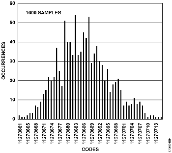 3线系统的典型无噪声码分辨率为:在选择sinc4滤波器的全功率模式下为17.9位,在使用后置滤波器的低功耗模式下为16.8位,这相当于每个温度测量分别有大约0.0033°C和0.0070°C的误差变化。图11和图12显示了连接3线RTD时的噪声分布。