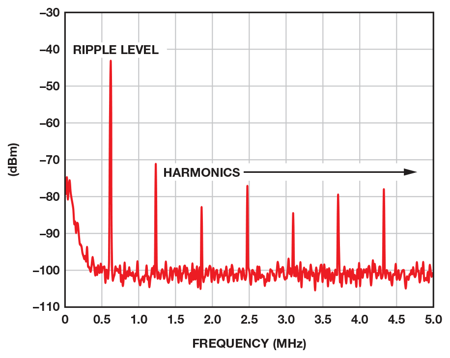 When measuring unwanted output signal artifacts, it is useful for power engineers to think of the frequency domain, as this provides a better perspective as to which discrete frequencies the output ripple and its harmonics occupy with each corresponding power level. Figure 2 shows an example spectrum. This type of information helps engineers to determine whether the chosen switching regulator is appropriate for their wideband RF or high-speed converter applications.