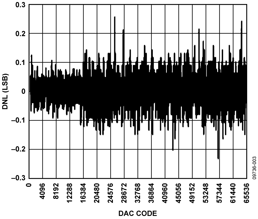 Integral nonlinearity (INL), differential nonlinearity (DNL), and output error are the most important specifications for PLC, DCS, and other process control systems. The AD5751 has highly flexible and configurable output ranges that can be tailored to meet the needs of the application. Measurements of INL, DNL, and output error for the circuit are shown in Figure 2, Figure 3, and Figure 4, respectively. This data was taken at 25°C in the voltage output mode using the internal current sense resistor. The AD5751 range was set for 0 V to 5 V. The test results for all the other ranges are listed in Table 1.