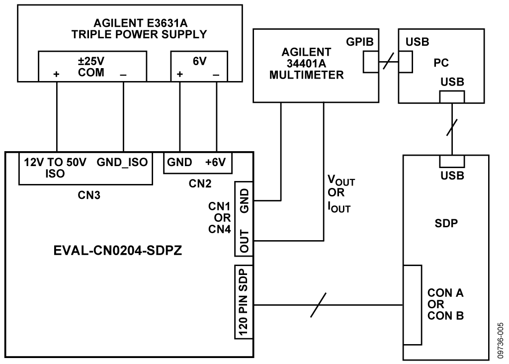 The test results shown in Table 1 were made at 25°C using the EVAL-CN0204-SDPZ board powered by an Agilent E3631A dc supply and measured with an Agilent 34401A digital multimeter.