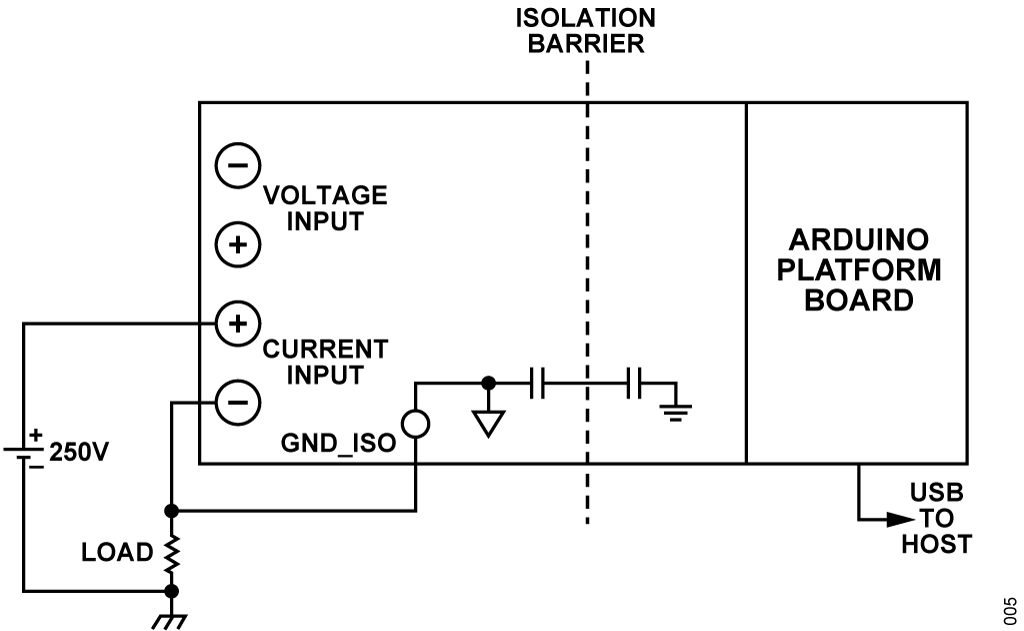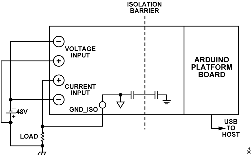 The CN0548 can be configured to accommodate a variety of measurement situations. The current sense input can be referenced to either the positive or negative voltage input terminal or any voltage in between, and measurement ground is isolated from the development platform and the connected host computer’s ground.