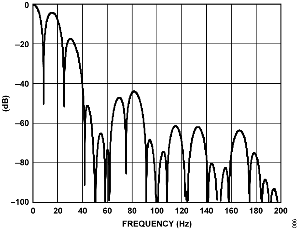 The AD7798 is a 16-bit low power, high-precision Σ-Δ analog to digital converter (ADC) intended for the measurement of wide dynamic range, low frequency signals, such as those in pressure transducers, weigh scales, and precision measurement applications. The AD7798 has three buffered differential inputs with a programmable instrumentation amplifier (in-amp), and on-chip digital filtering. An external reference voltage between 100 mV and 5.25 V determines the full-scale input range. The output data rate of the AD7798 is user-programmable from 4.17 to 470 sps; the measurement bandwidth, and hence sensitivity to noise, is proportional to the output data rate. Most power supply measurement applications do not require a high sample rate and can take advantage of the narrow bandwidth provided by lower output data rate modes. Furthermore, sample rates of 16.7 sps and lower provide simultaneous rejection of 50 Hz and 60 Hz line noise. The AD7798 uses slightly different filter types, depending on the output data rate, in order to minimize the effect of internal noise sources. Figure 8 shows the filter response for the for the 16.7 Hz mode. Refer to the AD7798 data sheet for a complete detailed description of all filter modes.