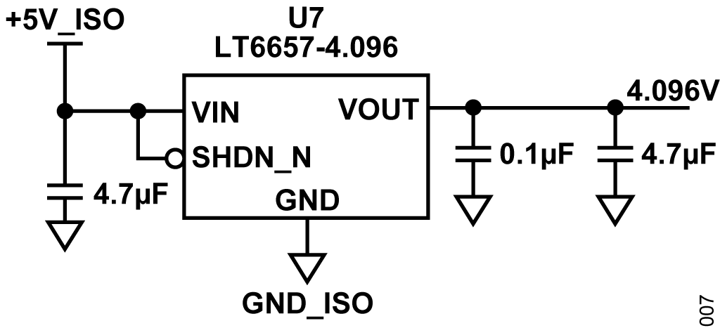 There are two voltage references used on the CN0548 board. An A-grade LT6657, shown in Figure 9, provides a 4.096 V reference voltage to the AD7798. This part offers exceptionally low noise for a bandgap reference; only 0.5 ppmP-P or an average of 1.24 μVp-p in the 0.1 Hz to 10 Hz bandwidth. It is stable with a large output capacitor, which serves to reduce high-frequency noise as well as providing a low-impedance for the AD7798’s dynamic sampling current. The line regulation of the LT6657 for 4.096 V output reference is typically well below 1 ppm/V. Load regulation is also less than 2 μV/mA. A 5 mA change in load current shifts output voltage by only 10 μV.