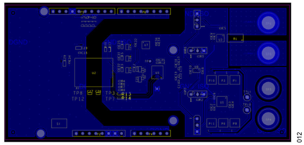 Figure 10 and Figure 11 show the circuit board isolation barrier. The board was designed for maximum creepage between grounds, with two 250 V safety rated type Y2 capacitors in series for reducing conducted noise from the LTM2886's internal switching regulator.