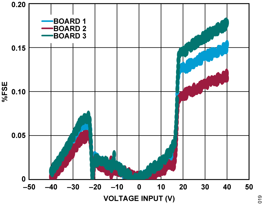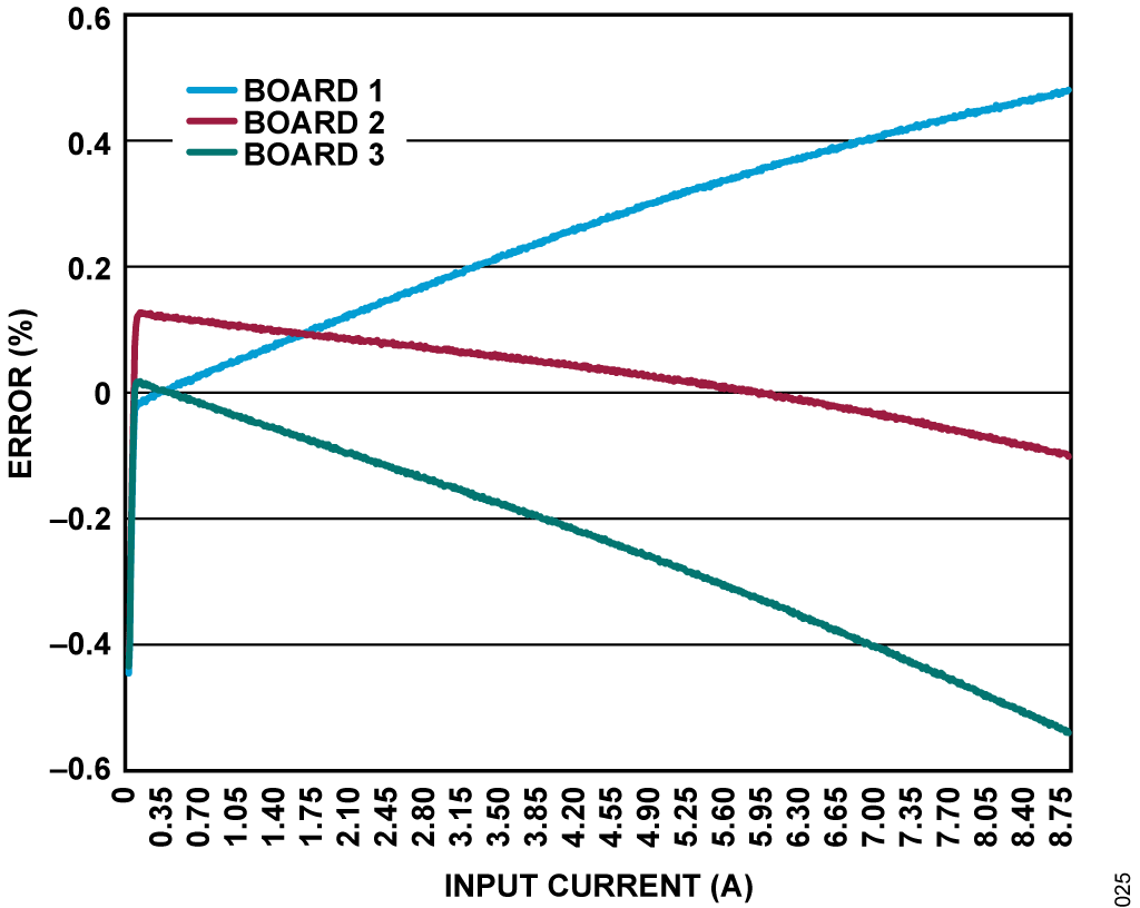 Figure 19 and Figure 20 show the uncalibrated accuracy of three individual CN0548 boards. The gain error is dominated by the±1% tolerance current sense resistor.