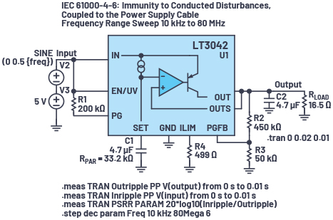 The LTspice circuit shown in Figure 18 can be used to simulate the PSRR of the LT3042. The time domain transient model shown in Figure 18 is an alternative to the AC sweep method. This time domain model is more flexible than an AC method, and even allows the user to simulate the PSRR of a switching regulator. The simulation circuit frequency sweeps changes in the voltage input rail and simulates the corresponding change in output voltage. In other words, the simulation evaluates the equation: PSRRLT3042 = (change in VIN)/(change in VOUT) over frequency.