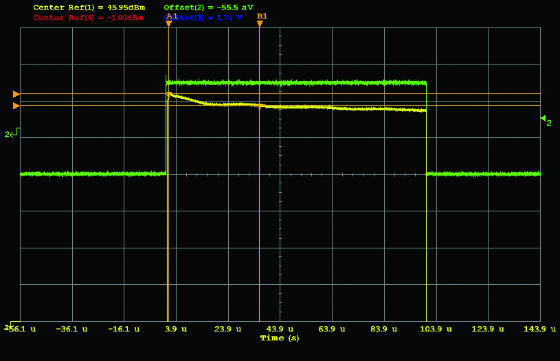 Using one of ADI’s S-band radar PAs, the ADPA1106, as a test vehicle, measurements were taken to test the impact of pulse width and duty cycle on pulse droop.