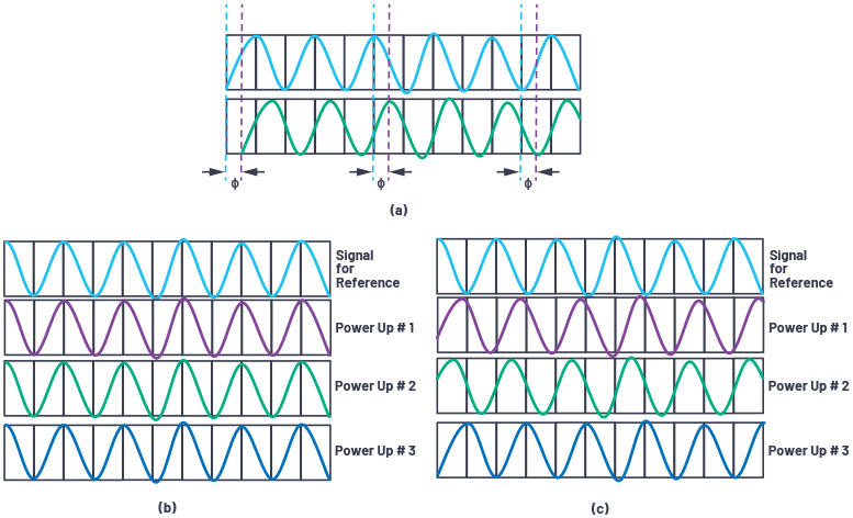 Coherence is a property of waves that defines the relationships existing in the physical quantities of a single wave or between two or more waves. In electronics, physical systems deal with phase, frequency, and amplitude of continuous wave and clock signals. In general terms, two signals are phase coherent if the difference between their phases stays constant and stable over time. Figure 1a shows the phase of two signals over time. The two signals exhibit a coherent phase relationship, as the phase between them remains constant. Figure 1b compares the starting phase of a reference signal in a system upon different power-up cycles. The coherent phase relationship over every power-up could also be observed here. However, Figure 1c presents an example where the phase is incoherent, as the signal starts with a random phase over every power-up.