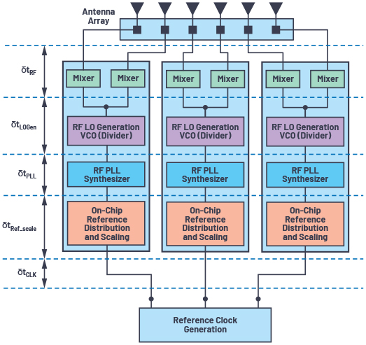 Figure 2 illustrates an example of a multichannel and multi-antenna RF subsystem architecture, which is based on integrated transceiver chips. There is an on-chip frequency synthesizer—a PLL—and a VCO for RF LO generation. The reference clock is generated externally to the transceiver chips and distributed to the device clock inputs respectively to each chip. Further scaling and distribution of the reference clock is done on the chip. In Figure 2, a breakdown of the propagation path is shown from the system reference clock to the antennas. The path could be split into different segments where each segment contributes a propagation delay. The variance in the propagation delay causes the variance in phase difference and perturbs the phase coherency in the system.