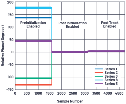 The measurements are taken for five power-up cycles and compared in different modes of operation. The system started without enabling the RF PLL synchronization feature. It can be seen that, with each power-up cycle, there is a random phase relation. After enabling the RF PLL synchronization feature, all five relative phase values converge to a repeatable value within a tolerance of ±2°. When continuous tracking is enabled, it maintains the relative phase value with some delay. This delay results in a 1° to 2° increase in the relative phase. Hence, a little shift could be observed in the figure. With this feature, stable phase value can be achieved within a deterministic tolerance. This reduces the impact of dynamic factors and simplifies the overall synchronization and calibration of the system.