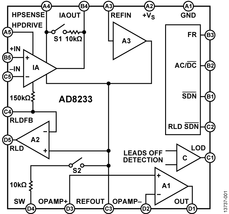 The AD8233 implements a two-pole, high-pass filter for eliminating motion artifacts and the electrode half cell potential. This filter is tightly coupled with the instrumentation amplifier architecture to allow both large gain and high-pass filtering in a single stage, thereby saving space and cost.