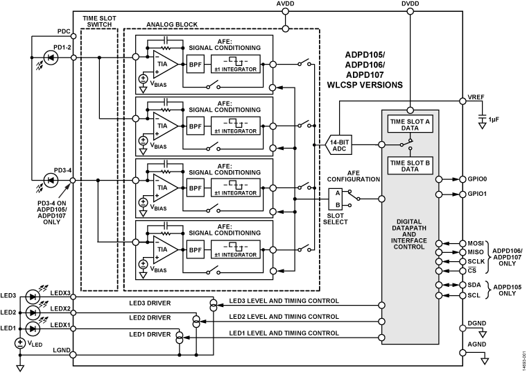 The ADPD105/ADPD106/ADPD107 are highly efficient, photometric front ends, each with an integrated 14-bit analogto-digital converter (ADC) and a 20-bit burst accumulator that works with flexible light emitting diode (LED) drivers. The accumulator is designed to stimulate an LED and measure the corresponding optical return signal. The data output and functional configuration occur over a 1.8 V I2C interface on the ADPD105 or SPI on the ADPD106 and ADPD107. The control circuitry includes flexible LED signaling and synchronous detection.