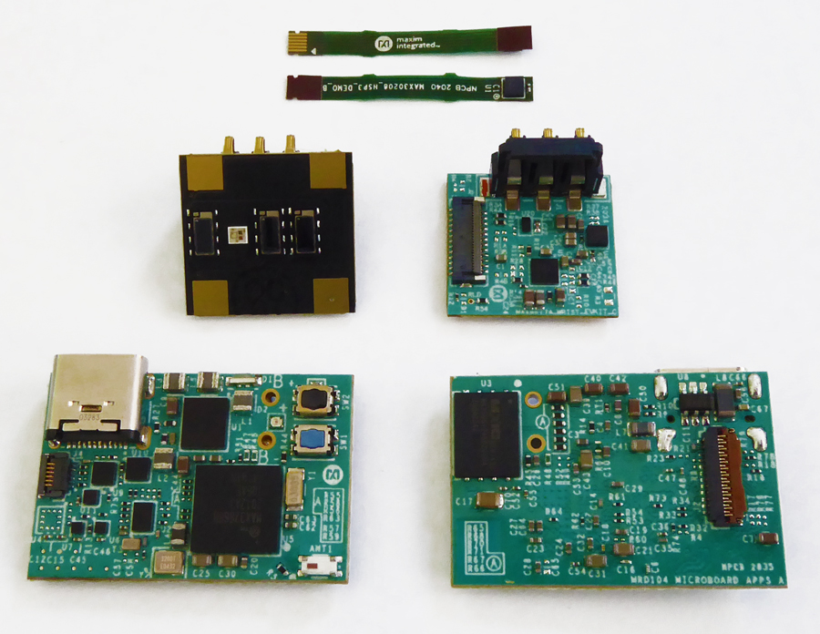 The MAXM86161OSBFLEX Flex-Rigid circuit board has a Analog devices MAX32664 Biometric Sensor Hub microcontroller device installed. This Sensor Hub can be used to implement Analog devices HR/SpO2 Algorithm for evaluation. The MAXM86161 GUI PC application code that allows evaluation of both the MAXM86161EVSYS# and the MAX32664 Sensor Hub is available in the MAXM86161EVSYS# EV System Design Resources tab.