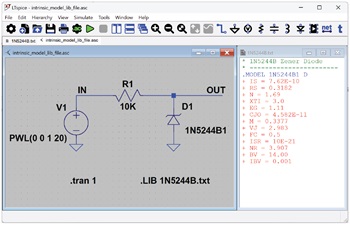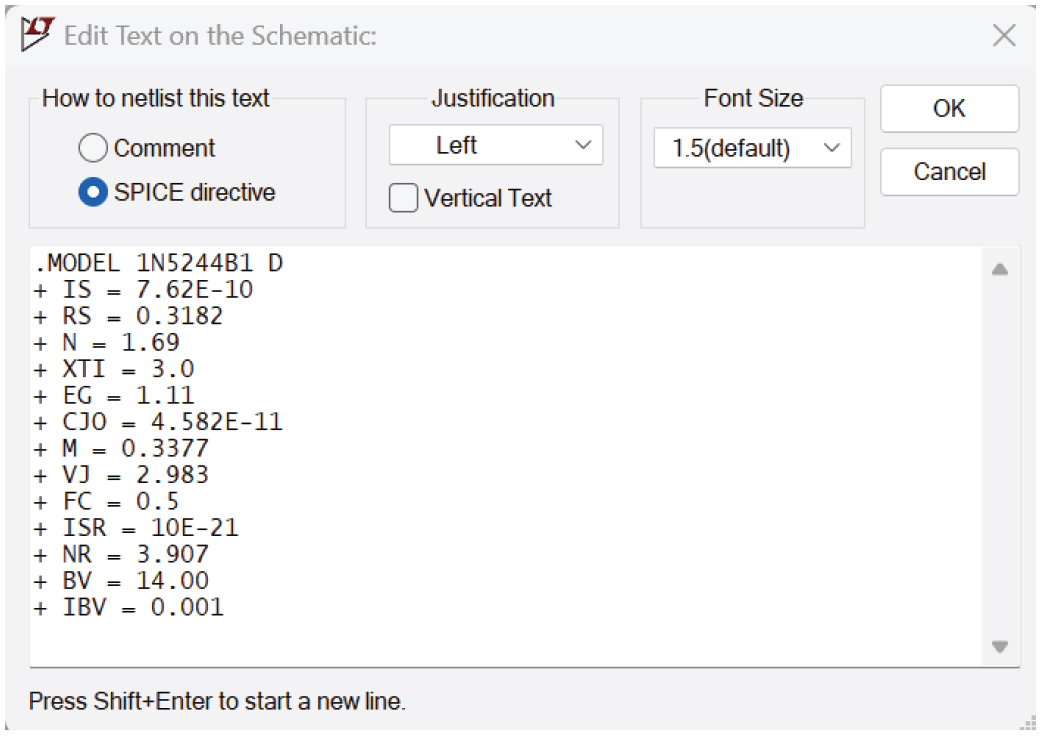 The simplest way to accomplish this is to ensure that the model text file is in the same directory as the schematic and import the contents of the file with a .LIB directive. Add the .LIB directive by selecting Edit > SPICE Directive from the menu or typing . (period) to bring up the Edit Text on the Schematic dialog. If the model file is in the same directory as the schematic file, you can import the file by typing .LIB <filename>. For this example, the filename is 1N5244B.txt.