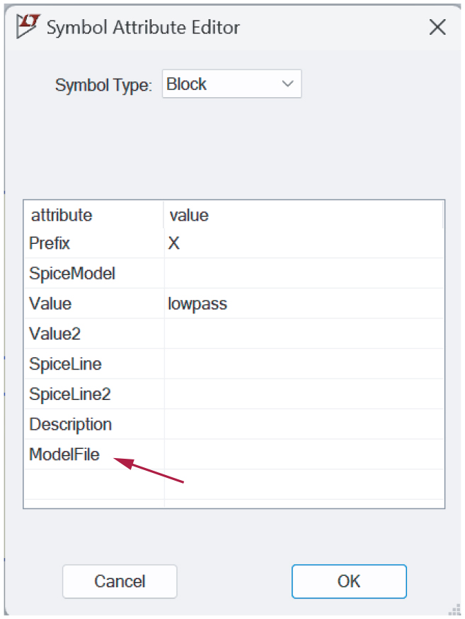 With the new symbol open in LTspice, right-click on the symbol and select Attributes > Edit Attributes. Delete any path information that has been added to the ModelFile attribute to improve the portability of this symbol. Click OK, then click Save.