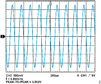 The theoretical maximum ac input swing is 10.23 Vp-p, but the CN0582 is only tested up to 10 Vp-p to meet the headroom requirements of the amplifiers. The same logic applies to maximum dc bias, which was only tested to 13 VDC. Centering the ADC output around zero by adjusting VSHIFT implies the IEPE_SHIFTED signal is equal to VOCM.