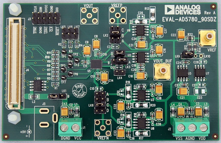 - +12 V to +16.5 V between the VDD and AGND inputs of J2 for the positive analog supply of the AD5790.
