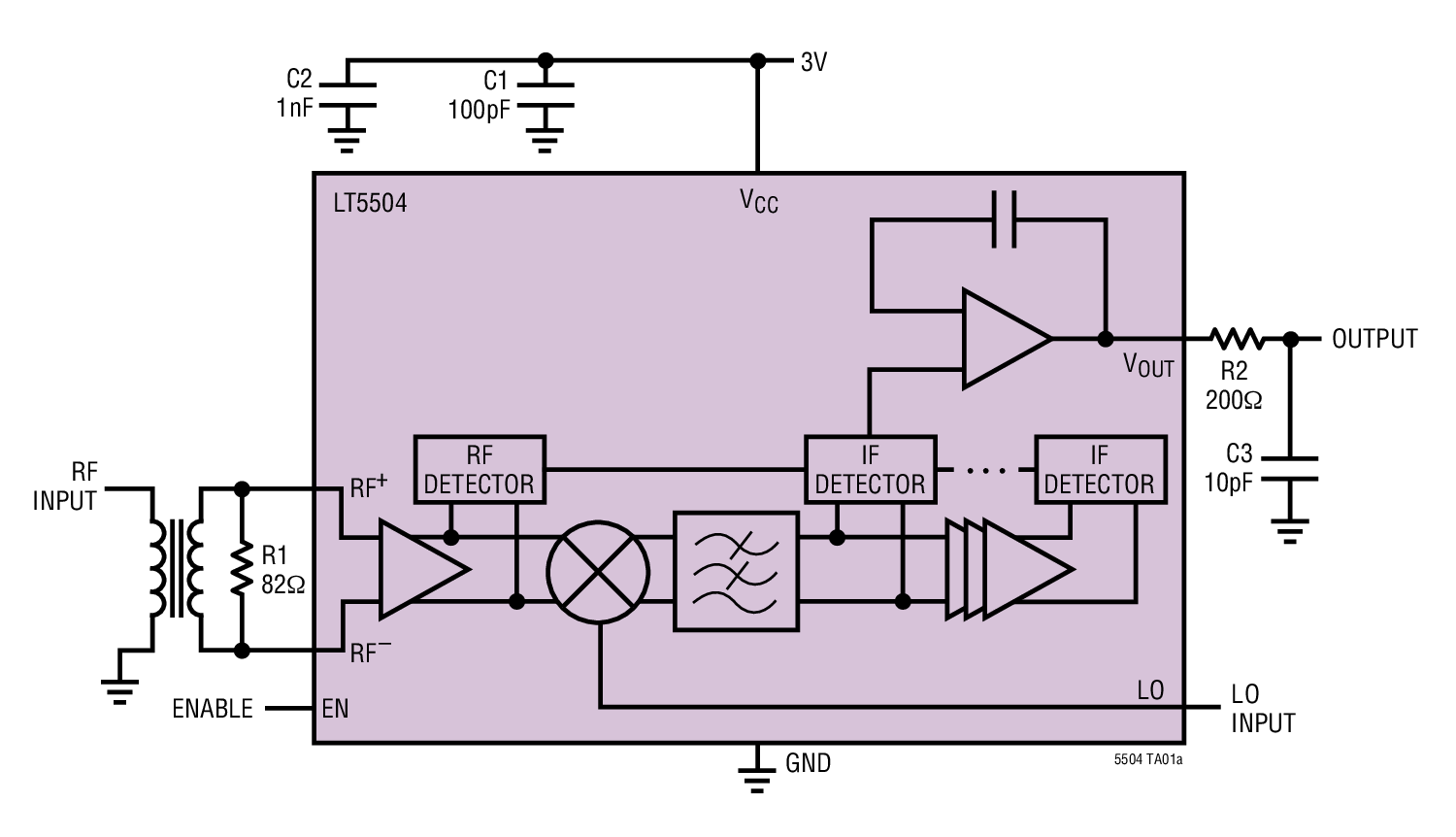 LT®5504 是一款 800MHz 至 2700MHz 单片式、集成化测量接收器,能够检测 –75dBm 至 +5dBm 的宽动态范围 RF 信号。RF 信号的对数被精确地转换为一个线性 DC 电压。LT5504 包括 RF/IF 限幅器、一个 LO 缓冲放大器、一个限幅混频器、一个三阶 450MHz 集成型低通滤波器、RF/IF 检波器和一个输出接口。超宽动态范围是通过同时测量 RF 信号和一个采用片内混频器和一个外部本机振荡器获得的下变频 IF 信号实现的。对 RF 和 IF 检波信号进行求和运算,以产生一个与输入 RF 电压 (或功率) 成比例的准确线性 DC 电压,单位为 dB。输出利用一个低输出阻抗驱动器进行缓冲。