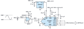 本应用中使用的2.5 V电压参考是ADR45xx 塑料封装电压参考系列中的 ADR4525,可以提供高精度、低功耗、低噪声,且具有±0.01%(±100ppm)初始精度、出色的温度稳定性和低输出噪声。ADR4525的低热致输出电压迟滞和低长期输出电压漂移提高了系统性能。950 μA的最大工作电流和500 mV的低压差(最大值)使该器件非常适合便携式设备。