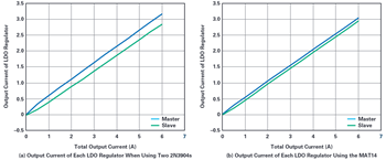 图4比较了使用分立式和匹配的NPN器件时每个LDO稳压器的相应输出电流。与2N3904相比,MAT14电流镜的电流失配率从5.3%降至1.6%。