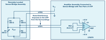 为了从CM(直流和干扰)中成功提取很小的电桥差分电压,一种解决方案是使用两对屏蔽或非屏蔽双绞线(UTP)。这样,仪表放大器的两个输入实现均衡,受到的CM噪声影响相同,如图4所示。诸如LT6370之类的器件具有出色的低频CMR (120 dB),能够可靠地抑制困扰IA输入的噪声。结果,即使在嘈杂的环境中,远距离输出波形也很干净。