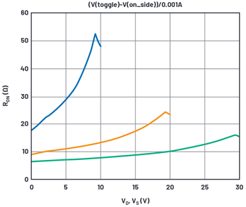 然后,我们确定 WP (开关中PMOS的宽度),以仿真最大电压下的 RON ,得到 WP = 1700 µm,,也远高于最初的猜测值。将 RDP也设置 为22 Ω,我们获得了图7所示的最终 RON 曲线。