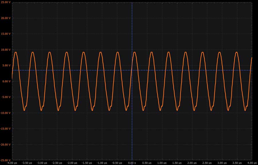 Having finished construction of the Clapp oscillator, ensure that the circuit is oscillating correctly by turning on both the +5 V and –5 V power supplies and connecting one of the oscilloscope channels to the output terminal. It may be that the value of R3 is fairly critical, producing either a large, distorted waveform or an intermittent low or no output. To find the best value for R3, it can be replaced by a 1 kΩ potentiometer for experimentation to find the value that gives the best wave shape and reliable amplitude.
