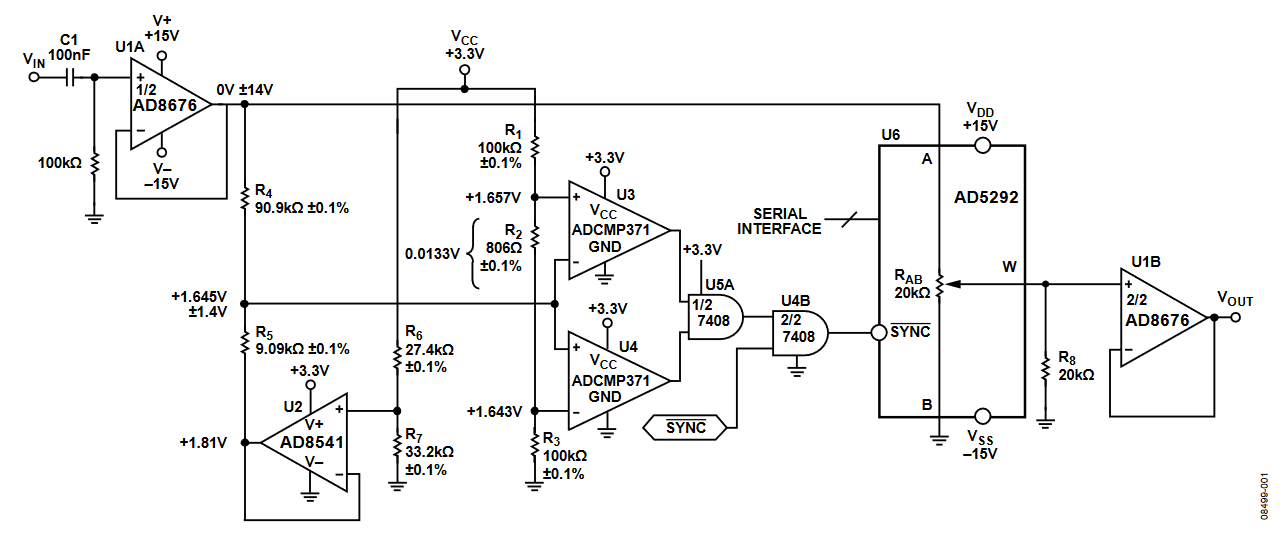 This circuit is a zero crossing detector that minimizes the glitch by allowing the attenuation to change only when the signal is crossing 0 V. Resistors R4 and R5 attenuate the input signal by 90.91% and establish the common-mode voltage of 1.645 V into the window comparator. The maximum uncertainty of the zero crossing is approximately 133 mV reflected to the input. The output of the window comparator is AND'ed with the external SYNC command to drive the SYNC input of the AD5292. After the negative-going edge of SYNC to the AD5292, the next clock pulse updates the internal DAC register.