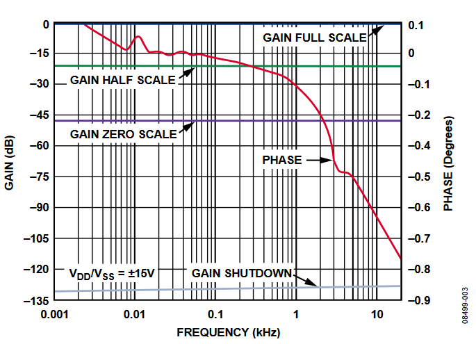 This circuit provides low total harmonic distortion (THD), a maximum signal attenuation of 46 dB, and a shutdown function that attenuates up to 130 dB, as shown in Figure 3. The AD5292 can be placed in shutdown mode by executing a software shutdown command. This feature places the RDAC in a special state in which terminal A is open-circuited and wiper W is connected to terminal B.