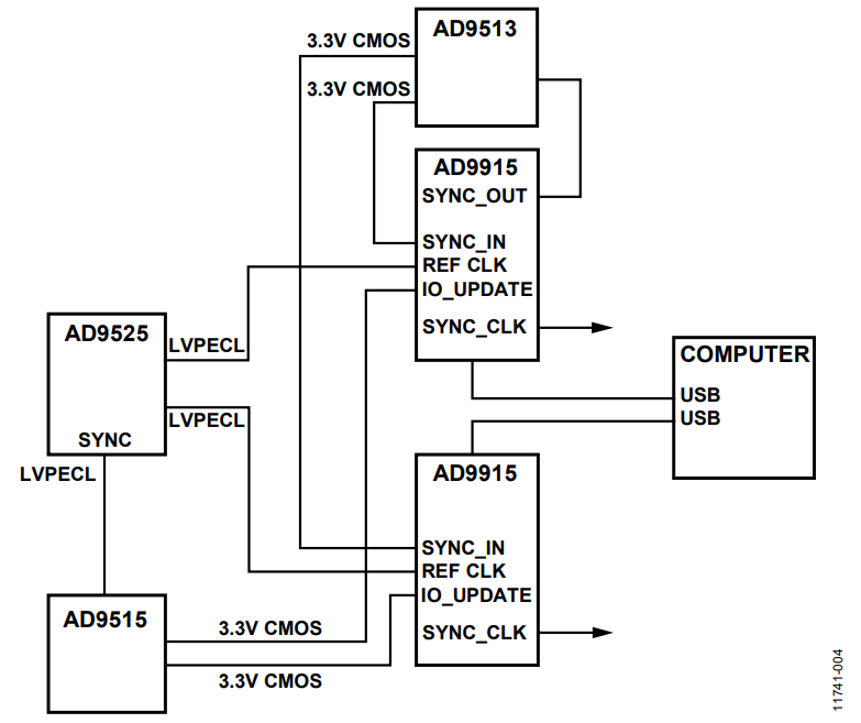 为成功同步,用户必须能控制每个器件的REF CLK、SYNC_CLK 和IO_UPDATE时序。目的是让所有DDS器件采用相同的内 部系统时钟计数工作,并且各器件之间的计数相差小于±1 或更多。因此,每个器件的SYNC_CLK必须互相对齐,且各器件的IO_UPDATE必须与SYNC_CLK同步,从而消除所有输出相位误差不确定性为±1或更高的系统时钟周期。