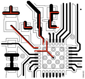 The ADE7978 package has a 3.3 mm × 3.3 mm exposed pad underneath the package. Create a similar pad on the PCB under the exposed pad and solder the exposed pad to it to confer mechanical strength to the package. Then, connect the pads to the GND pin and the DGND pin, as shown in Figure 22.
