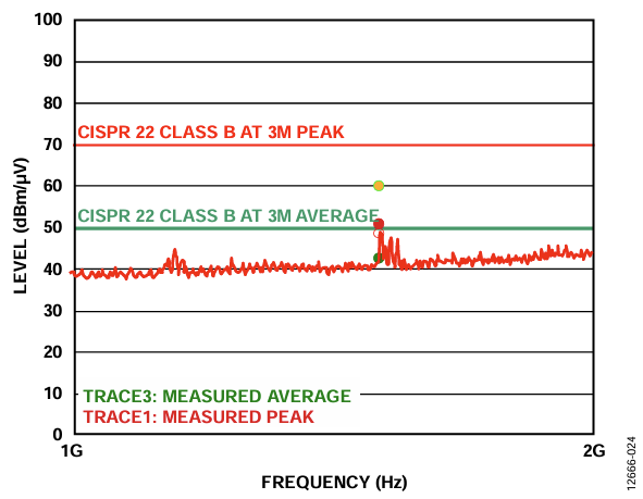 With a stitching capacitor of 84 pF (1,100 mm2 plates), a minimum 11 dBµV/m quasi peak margin to Class B CISPR22/EN-55022 limits was obtained for frequencies between 30 MHz and 1 GHz (see Figure 23). For frequencies between 1 GHz and 2 GHz, a minimum 10 dBµV/m average results margin to Class B CISPR22/EN-55022 limits was obtained (see Figure 24).