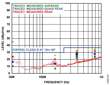 The ADE7978 evaluation board was tested for compliance with the Class B CISPR22/EN-55022 standard. The board was placed in a 3-phase meter case and was powered from a battery. A 5 m, 3-phase cable, without termination, was mounted on the meter and then placed under the floor in the anechoic chamber. Note that the ADE7978 evaluation board contains four ADE7933 isolated ADCs.