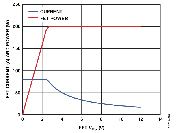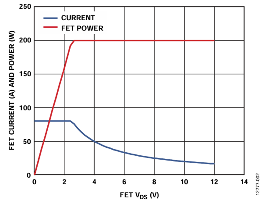 The ADM1278 utilizes a constant power foldback technique to protect the MOSFETs in the event of overcurrent faults or short circuits. The VDS of the MOSFET is monitored. The current limit is adjusted based on the VDS of the MOSFET to maintain a constant power limit. See Figure 2 for an example of this relationship.