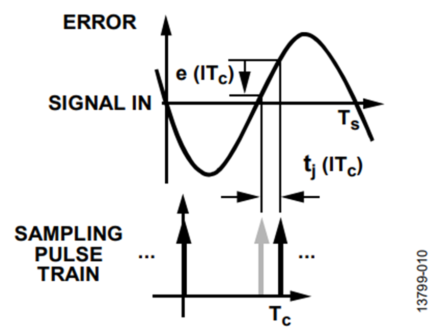 修改的采样脉冲串的频谱难以用分析方式表示,因而输出频谱也无法表示。可以讨论的是抖动引起的瞬时加性误差,假设输入信号为正弦波(参见图10)。