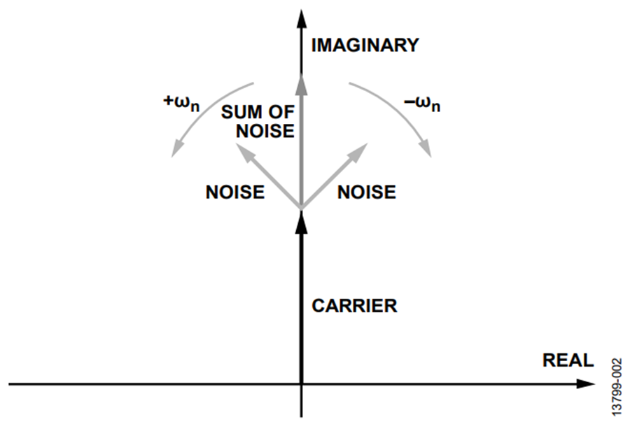 其次,任何加性噪声矢量都可以被解释为AM噪声(与载波同相)和PM噪声(与载波正交)之和。如果关注的是PM噪声,则必须消除AM分量,然后根据边带功率估计相位噪声功率。