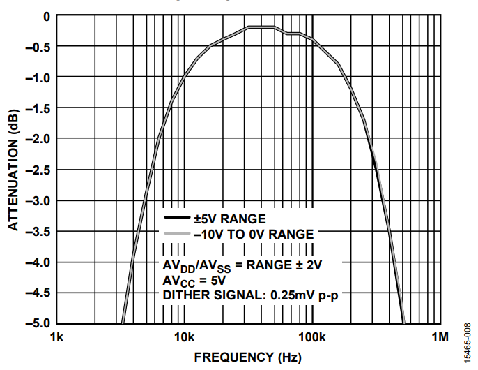 There is a certain dependency on the input dither transfer function with the selected output voltage range in terms of attenuation and phase shift. Figure 8 and Figure 9 show typical performance at the ±5 V output voltage range.