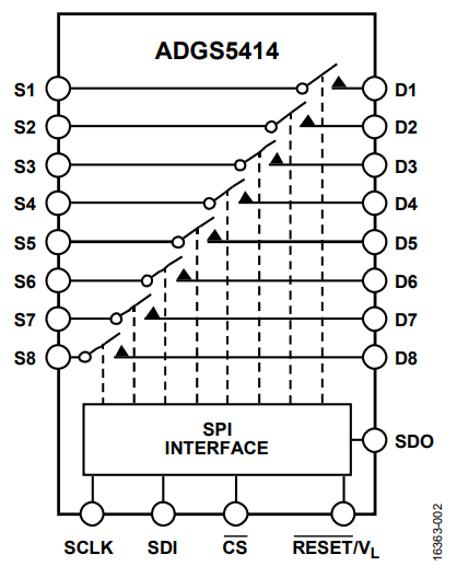 Analog Devices SPI switches have a 4-wire serial interface with error detection features. Figure 2 shows the functional block diagram of one of the SPI switches, the ADGS5414. Figure 2 shows the four pins that make up the SPI portion of the device. These are the serial clock input (SCLK), serial data input (SDI), serial data output (SDO), and chip select (CS). RESET/VL powers the SPI block and can be used to perform a hardware reset.
