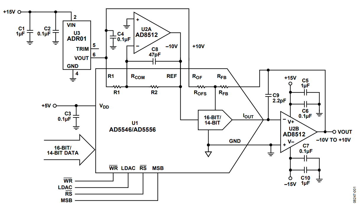 The circuit shown in Figure 1 provides precision, bipolar data conversion using the AD5546/AD5556 current output digital-to-analog converter (DAC) with the ADR01 10 V precision reference and AD8512 operational amplifier (op amp).