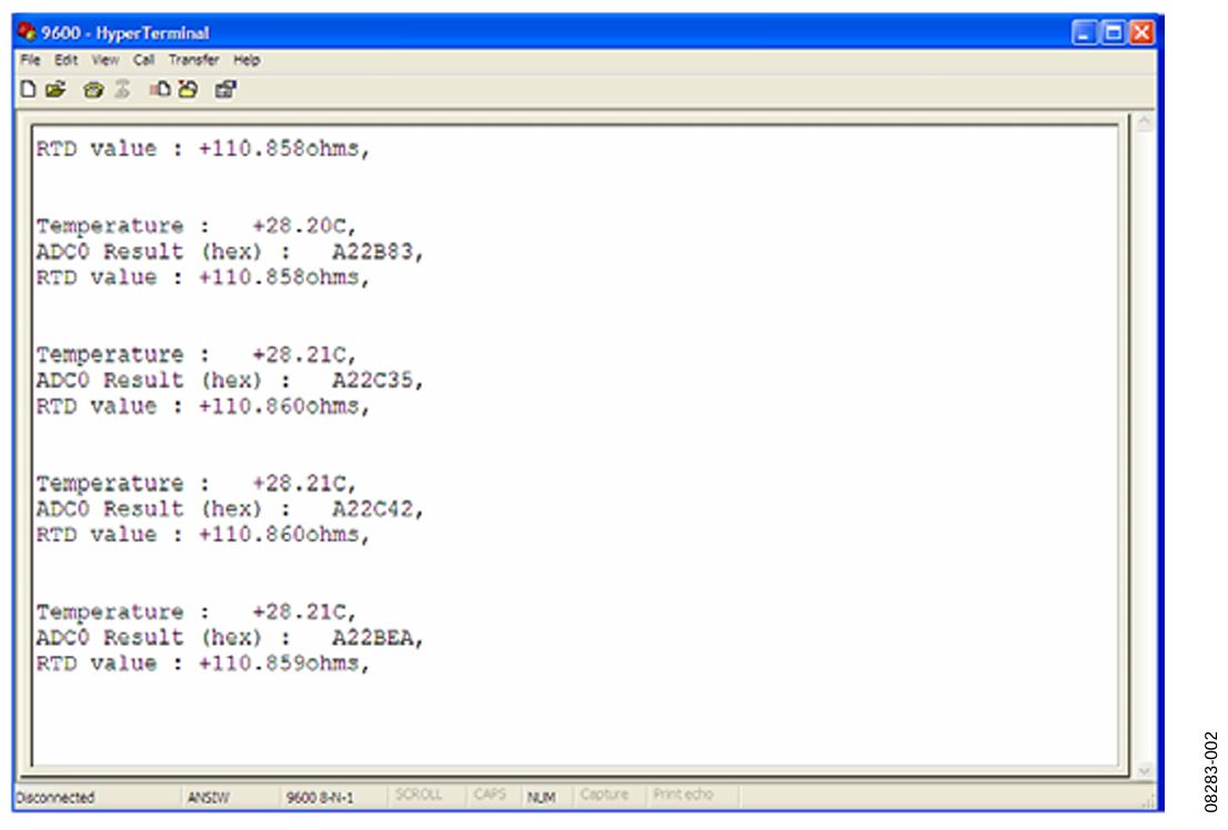 The UART is configured for a baud rate of 9,600, 8 data bits, no parity, and no flow control. If the circuit is connected directly to a PC, use a communication port viewing application such as HyperTerminal® to view the results sent by the program to the UART (see Figure 2). The source code is commented to make it easier to understand and manipulate.