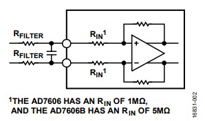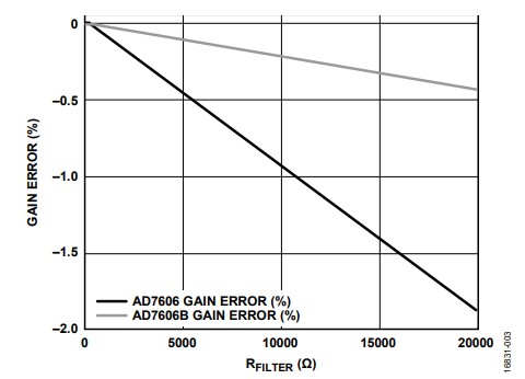 尽管AD7606具有1 MΩ的典型输入阻抗,但AD7606B具有 5 MΩ典型输入阻抗,这使AD7606B对输入串联电阻 (RFILTER)产生的增益误差不太敏感,如图2所示。