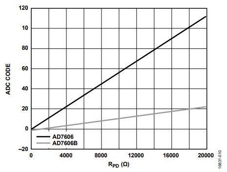 建议采用比传感器的源阻抗大得多的 RPD,将该并联电阻可 能产生的误差减至最小。但是, RPD越大,传感器断开时产 生的ADC输出代码就越大,而ADC输出代码大会导致无法 察觉的传感器断开,这并非期望结果。由于AD7606B的 RIN 比AD7606大,对于给定 RPD,如果传感器断开,ADC输出 代码将降低。例如,给定 RPD = 10 kΩ时,在AD7606上ADC 输出代码约为58 LSB(±10 V范围),在AD7606B上约为 11 LSB。