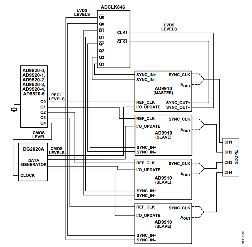 The setup uses the AD9520-0, AD9520-1, AD9520-2, AD9520-3, AD9520-4, or AD9520-5 as the REF_CLK source for each AD9910. The AD9520-0, AD9520-1, AD9520-2, AD9520-3, AD9520-4, or AD9520-5 runs off an external crystal and the internal phase-locked loop (PLL). The AD9520-0, AD9520-1, AD9520-2, AD9520-3, AD9520-4, or AD9520-5 distributes phasealigned, 1 GHz REF_CLK signals (positive emitter-coupled logic (PECL) outputs) to all four EVAL-AD9910 evaluation boards. The AD9910 provides a complementary metal-oxide semiconductor (CMOS) output clock to the DG2020A data pattern generator for the I/O_UPDATE signal.