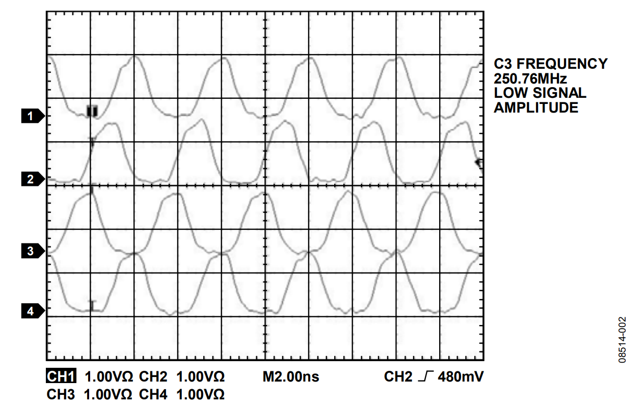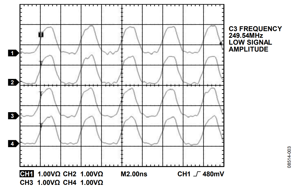 Figure 2 shows all four SYNC_CLK signals with the AD9910 internal synchronization circuit disabled. Note that the SYNC_CLK signals are not inherently aligned, even when the REF_CLK signals are phase-aligned.