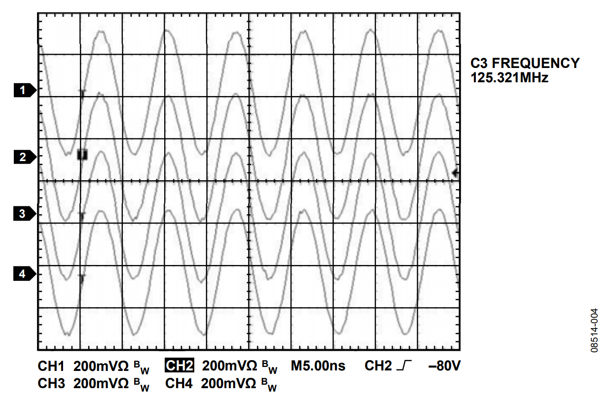 The circuit in Figure 1 was constructed by connecting the respecttive evaluation boards for the individual devices. Connections were made with matched cable lengths. The first of three basic requirements to synchronize multiple AD9910 devices is to provide a coincident reference clock (REF_CLK).