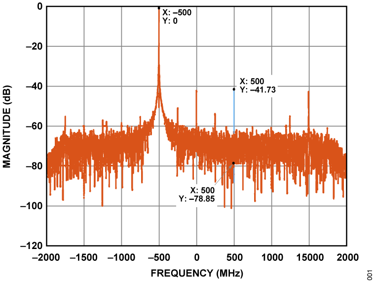 To measure the image rejection of a radio, the image rejection ratio (IRR) in dB is commonly used. IRR is defined as the ratio between the desired signal level at a frequency component and the signal level at the image frequency. Figure 1 shows a desired tone at −500 MHz and an image at 500 MHz, the image rejection ratio is about 40 dB. In a perfect mixer, the image rejection ratio can reach around −78 dBc.