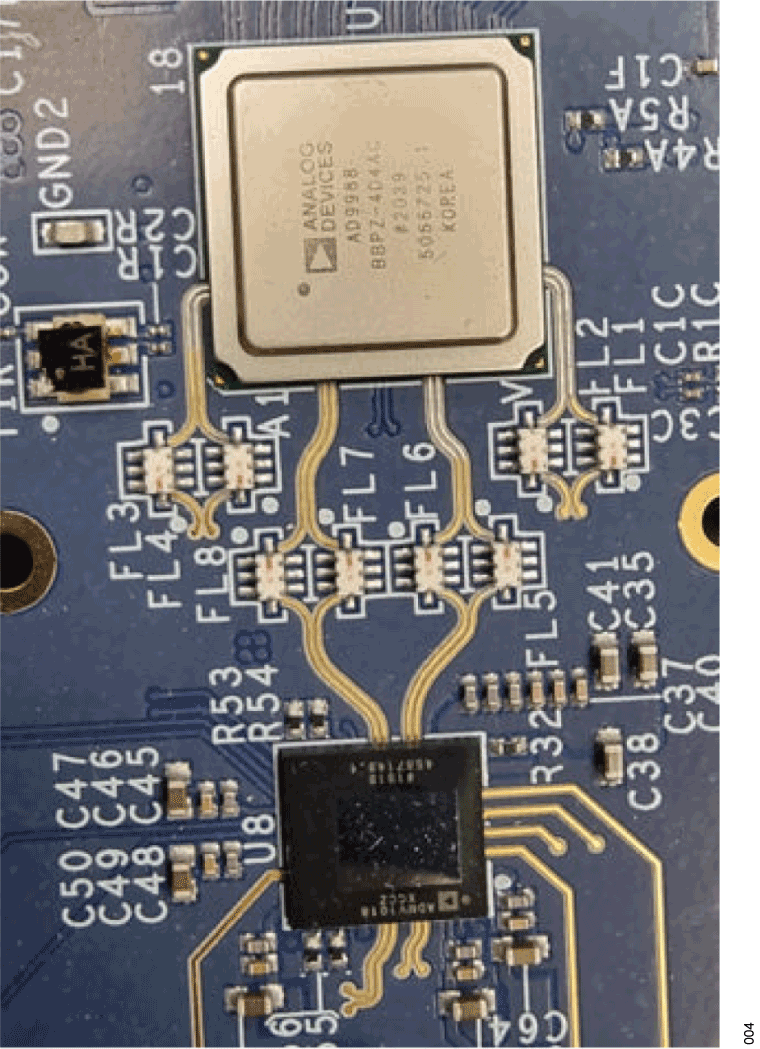 The QEC measurements are performed using high-rate data converters AD9988 connected to the frequency converter ADMV1018 on a printed circuit board (PCB). Two transmit channels (DAC) of AD9988 are connected to the two baseband ports of the ADMV1018 (IIN and QIN), while two receive channels of AD9988 (ADC) are connected to two baseband ports (IOUT and QOUT) of ADMV1018. The board is designed such that the trace lines between AD9988 and ADMV1018 are balanced in terms of gain and phase.