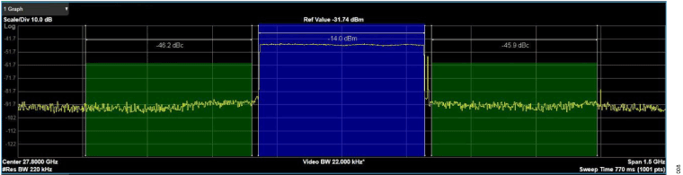 Figure 7 shows 400 MHz NR 5G signal centered at 27.8 GHz. The image signal is about 22.6 dBc. When applying the QEC algorithm, the image is suppressed, and the IRR is about 46 dB.